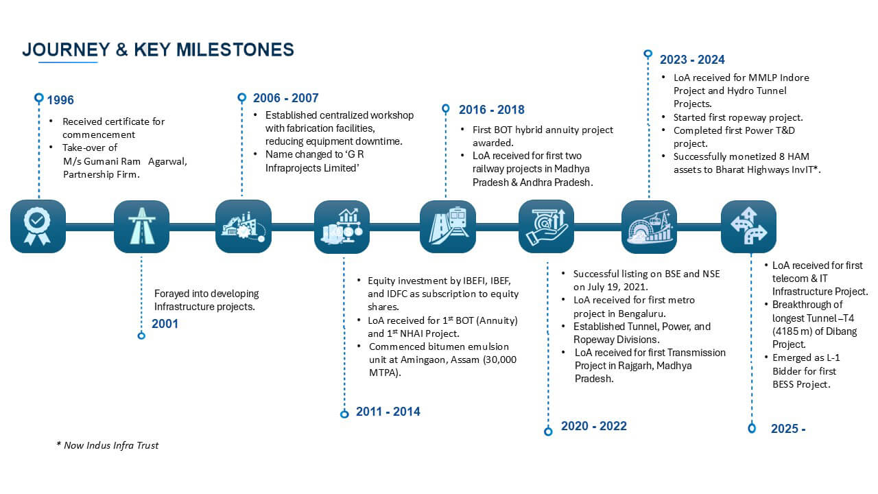 Starting from small-scale road projects, G R Infraprojects Limited quickly grew by tackling complex challenges. Established formally as G. R. Agarwal Builders and Developers Limited in 1995, the company acquired Shri Gumani Ram Agarwal’s original firm, M/s Gumani Ram Agarwal the same year, bringing-in his pioneering legacy as a foundational pillar. In 2007, recognizing the expansion of its capabilities, the name was changed to ‘G R Infraprojects Limited’ to reflect a broader vision. Today, G R Infra (NSE: grinfra) stands as a listed company, admired for its engineering excellence and commitment to quality.